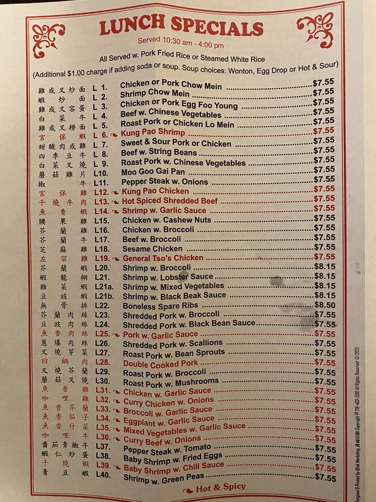 - Combination Platters: Specialties like Pepper Steak with Onions and BBQ Spare Ribs are not only delicious but come paired with crispy pork egg rolls and your choice of rice, making them hearty and satisfying.